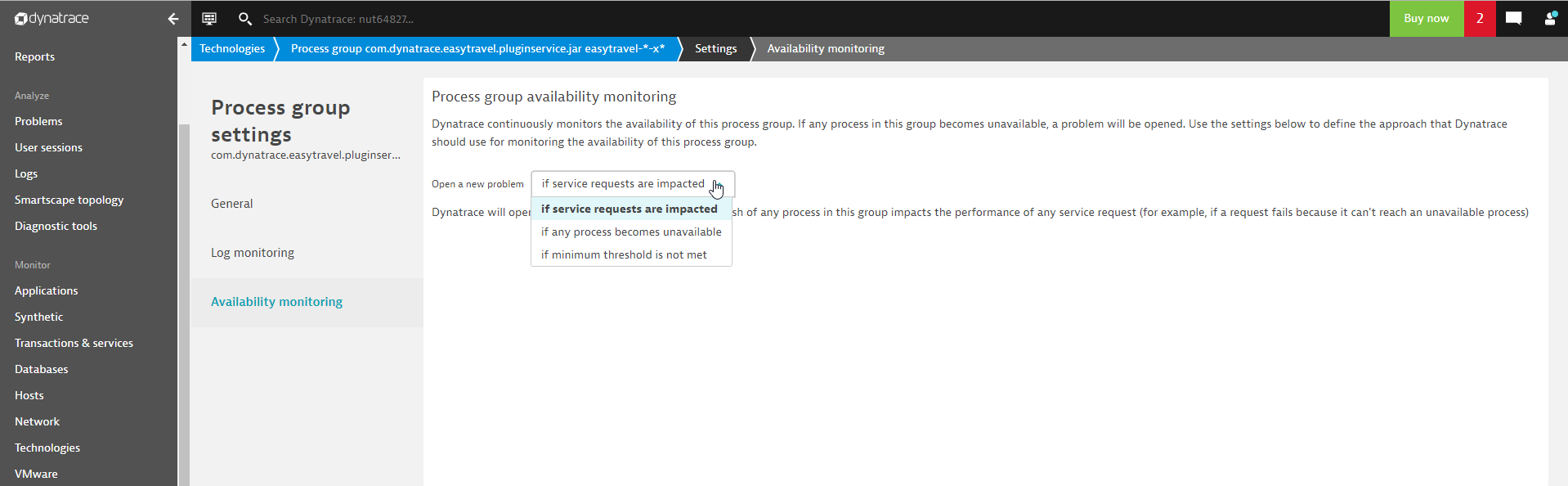 You find the process availability alerting within the process group settings section as shown below. We don't want to alert on a process restart alone as it would be extremely spammy for all the detected process groups.