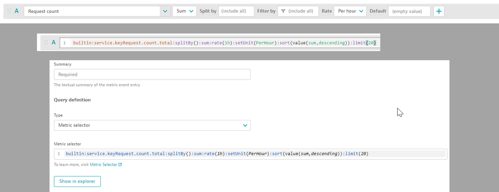 We create a metric selector for a specific metric and we want to setup a custom event if this query exceeds a certain value for more than 2 hours. The maximum sliding window allowed is 1 hour, so we can't seem to find a way to do this. And this specific issue extrapolates to a more generic one: how can we deal with long-term alerts? Is there any way to change the interval granularity of metric keys/selectors for alerting reasons?