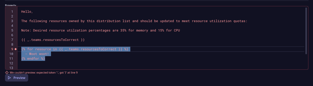 It's important to note here that within each struct/item I'm looping through is a list of structs, with each struct containing further information. This list of structs is called "resourcesToCorrect", and I'm referencing it in the content as {{ _.teams.resourcesToCorrect }}. Printing out the struct in the content works just fine and returns the data, but because I'm not doing any formatting, it's unreadable. Hence why I'm wanting to loop through this list, so that I can format the information in a way that is easy to read by the receiver.