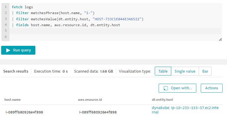 We see the host name as it should be in the field dt.entity.host, but that's only a "live translation" Dynatrace does, since in reality the field value is the Host ID (HOST-XYZ0123...).