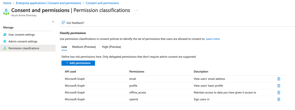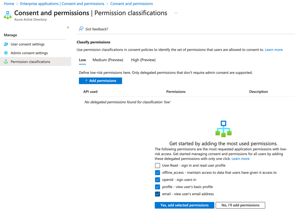 Then, we require the following "low impact" API permissions to be allowed to be constented to by users:
