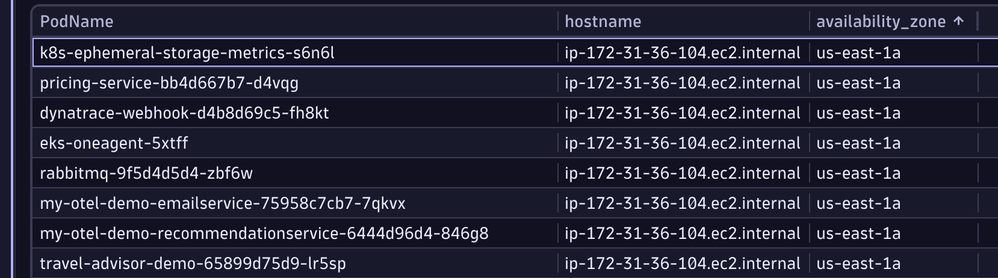 I'm trying to create a dashboard or a DQL query that gives me the AZ all of my pods are in. I see that in the EC2 Node metadata I can see what AZ those nodes are in, and of course I can see what AZ the pods running on that node are in, but I want the information in one single view with all of the pods (or filterable list).