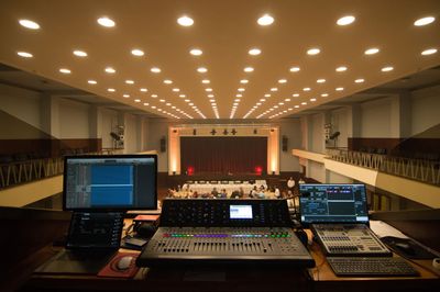In the center, there's the beauty to my eyes: a Midas M32 sound mixer. A fantastic piece of engineering! It sounds amazing, never fails, and it's even remote controlled on a tablet or smartphone... allows me to work the sound without having to be stuck on that lonely booth all the time 😁 πŸ‘€