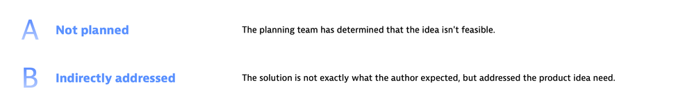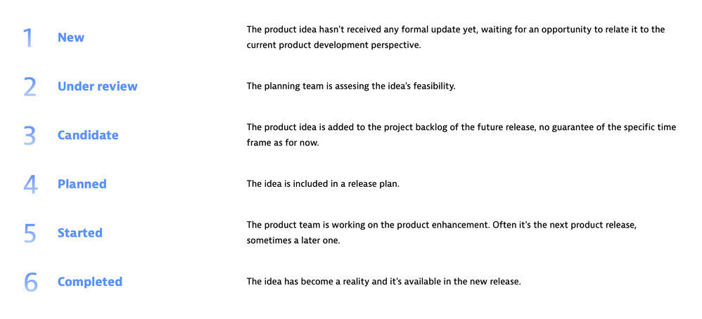 In the Product ideas forum, you’ll find different statuses at the top of the page. Simply select a status to see all ideas currently in that stage of the review and development process.