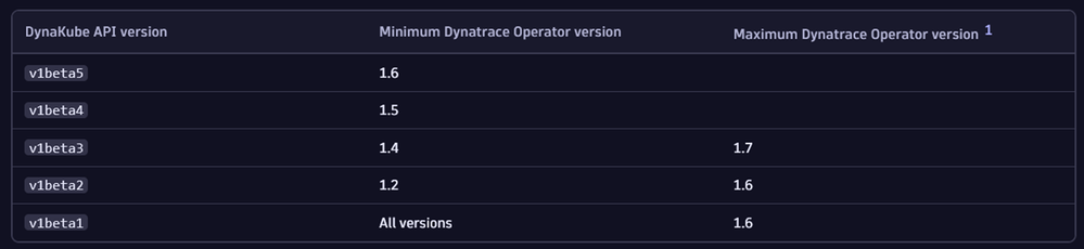 The following versions of the Dynakube API CustomResourceDefinition are selected to be deprecated and will be eliminated in the specific versions of the Dynatrace Operator: