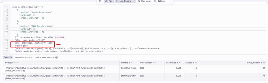 | fields productos,nombre, orderNumber, totalPedido, cantidad, precio_unitario