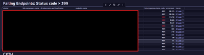 | summarize errorcount=count(), by:{cluster, k8s.namespace.name, dt.kubernetes.workload.name, endpoint.name, http.response.status_code, traces}