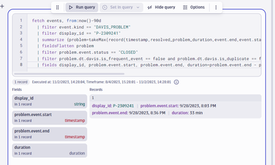| summarize {problem=takeMax(record(timestamp,resolved_problem_duration,event.end,event.start,dt.davis.is_duplicate,event.status,maintenance.is_under_maintenance,dt.davis.is_frequent_event)) }, by:{display_id}