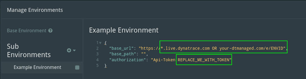 For each of your dynatrace environments you want to use, add a insomnia environment environment dropdown -> Manage Environments: