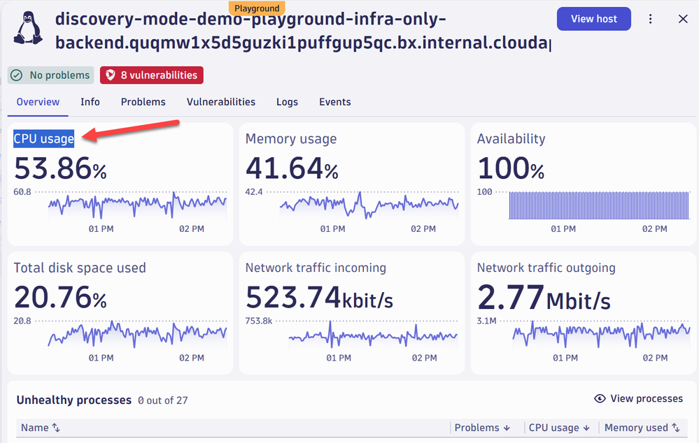Here in the playground, I can access a host and see the tiles for the performance of the host. Yes, I could use a Metric Query to pull CPU, but it is also a great example to showcase this pro tip.