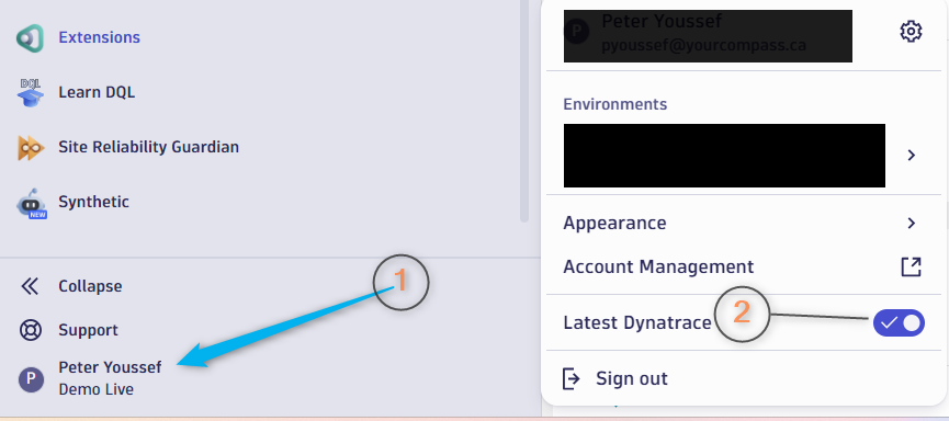 When you access Dynatrace platform based on your assigned permissions you will see the shown button to switch to the latest Dynatrace UI.