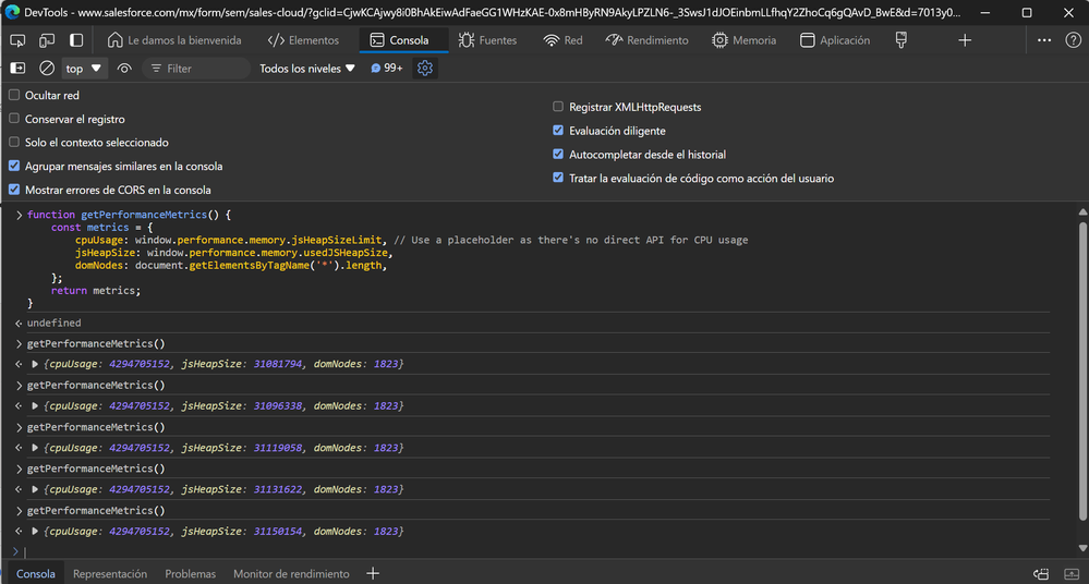 jsHeapSize: window.performance.memory.usedJSHeapSize,