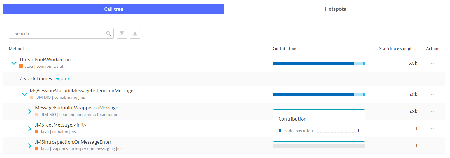 In the screenshot below you can see that the total stack trace samples is 5.8K and if you were to hover of the contribution and sum the parts it would be 5.8k as well. Similarly, the JMSIntroscope method had a stack trace sample of one and the contrubution bar seems empty compared to the other methods (since the count was so low) and it matches the stack trace with a value of one.