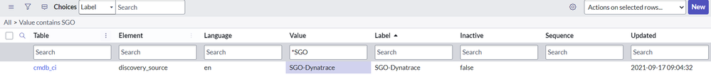 To allow Dynatrace to report discovered configuration items (CIs) in your CMDB, verify that the discovery data source SGO-Dynatrace exists.
