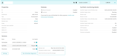 You can confirm the versions of the ActiveGate, Synthetic Module, and Chromium on the Deployment Status > ActiveGates page. The Last Update column will report 'Skipped' or 'Failed' if an issue occurred.