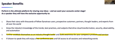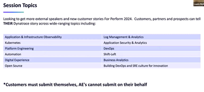 Vous pouvez postuler directement sur https://www.dynatrace.com/perform/ Vous y trouverez un document concernant ''Call for Proposals'' avec de l'information; contenant entre autres ''Que constitue une bonne postulation?''